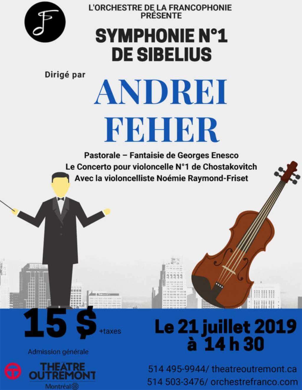 Andrei Feher rencontre l’OF : Symphonie no 1 de Sibelius, Concerto pour violoncelle de Chostakovitch avec Noémie Raymond-Friset et Pastorale-Fantaisie de George Enescu (première nord-américaine). 21 juillet, 14h30, Théâtre Outremont. 15 $ + tx.
