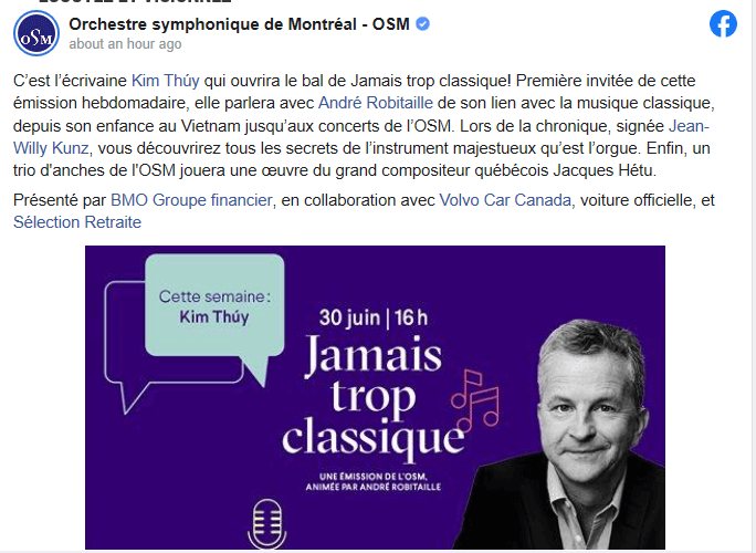 Des personnalités seront invitées par André Robitaille pour parler de musique. La première sera l’écrivaine Kim Thuy. Ces émissions seront enregistrées dans l’Espace OSM, situé non loin de la Maison symphonique, à l’intérieur de la Place des arts.