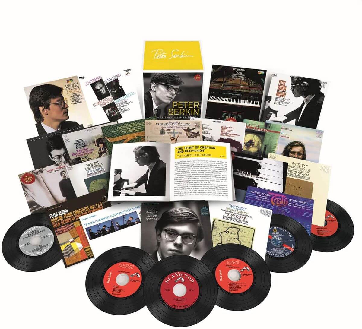 D’une plateforme à l’autre et souvent gratuitement malheureusement, la musique se consomme. Mais il reste encore des objets de luxe que nous devons posséder, non pas pour l’esbroufe, mais la musique elle-même. Je songe en regardant mes rayons à Samson François, Pierre Fournier, Maurizio Pollini, Aldo Ciccolini, et pourquoi pas Peter Serkin (1947-2020). Fils du célèbre pianiste Rudolf Serkin, que nous retrouvons parfois dans ce coffret en tandem avec son fils, c’est avec un plaisir non dissimulé que j’ai ouvert ce très beau boitier de 35 disques avec les pochettes originales ainsi qu’un fort livret qui nous explique le bien-fondé de cette démarche historique.