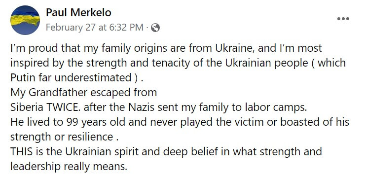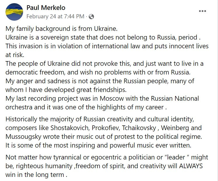 Parmi les nombreuses réactions de musiciens sur les médias sociaux, remarquons celles de Paul Merkelo, trompette solo de l’OSM, dont les racines sont également ukrainiennes :