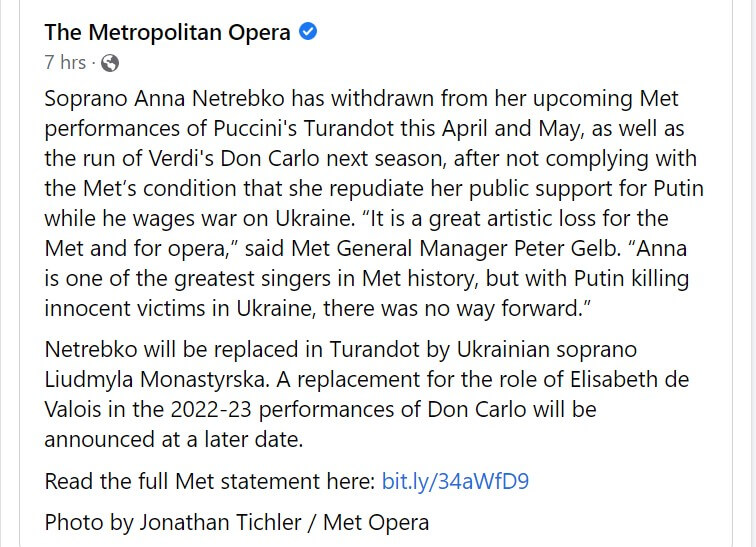 - Le 1er mars, la soprano russe Anna Netrebko a annoncé cette semaine qu’elle mettait sa carrière en pause. Elle ne fera pas partie des deux prochaines saisons du Metropolitan Opera, entre autres.