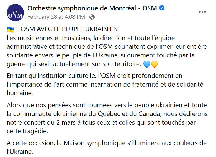 - Hier soir, 2 mars, l’OSM a également joué l’hymne national de l’Ukraine, sous la direction de Mélanie Léonard, alors que tous les musiciens portaient un ruban jaune et bleu. Un spectateur mécontent a crié sa désapprobation de la mezzanine, mais l’ensemble de l’auditoire a manifesté son appui.