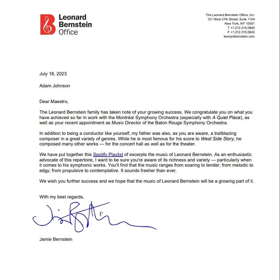 D’autre part, il recevait récemment une lettre de Jamie Bernstein, la fille de Leonard Bernstein, le félicitant pour son travail de ces dernières années avec l’OSM, en particulier dans le cadre de la présentation de l’opéra A Quiet Place.