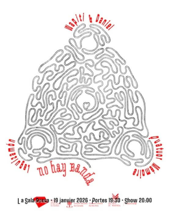 No Hay Banda, récipiendaire en novembre dernier du prix Siemens, produi ce concert consitué d’artistes invité·e·s. En première partie, le duo Wapiti interprétera une œuvre du compositeur colombien Daniel Leguizamón sur le thème de l’énergie unique créée à chaque concert entre les artistes, la salle et le public. Selon lui – et nous devons lui donner raison -, chaque salle, avec ses particularités acoustiques, a sa propre empreinte sur la musique qui est jouée. Il en va de même pour l’effet des lieux sur les artistes et le public. Sa composition Tallado en el aire explore donc cette facette. En deuxième partie, le Quatuor Mémoire, ensemble de musique contemporaine, interprétera deux œuvres de compositrices montréalaises, Hannah A. Barnes et Lily Koslow. La soprano Rebecca Gray se joindra au groupe pour The Mysteries Remain de Barne, alors que, pour l’interprétation de Zed de Koslow, la compositrice elle-même rejoindra les cordistes.