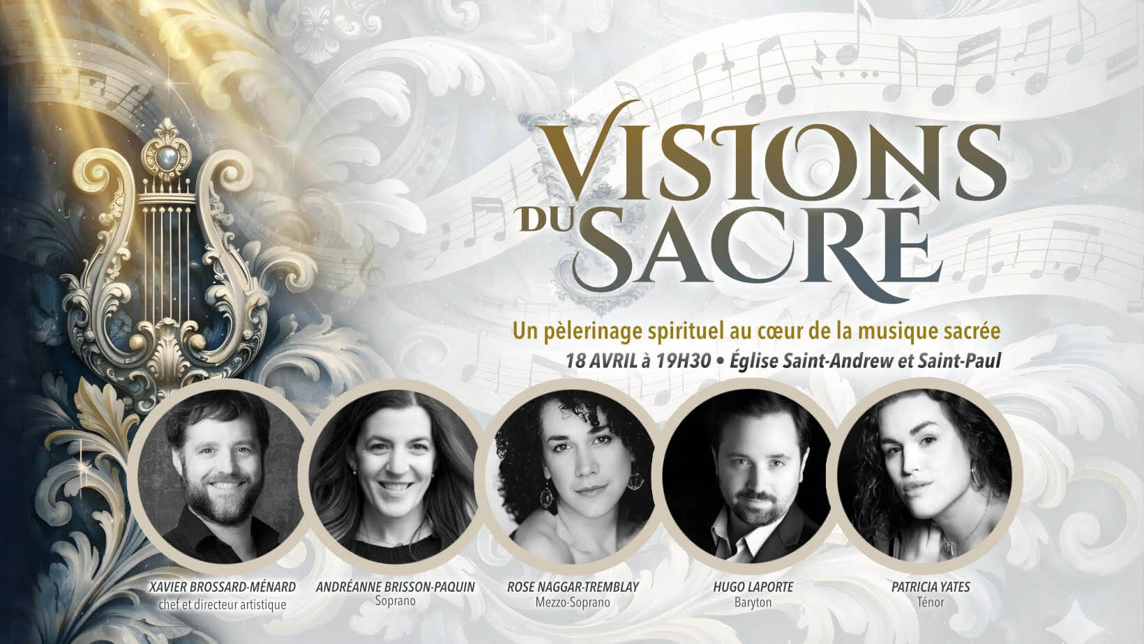 L’ensemble vocal Musica Orbium complète sa première saison sous la direction du directeur musical Xavier Brossard-Ménard par un concert intitulé Visions sacrées, présenté ce samedi 18 avril à l’église Saint-Andrew et Saint-Paul. Le chœur, accompagné d’un orchestre de 16 instrumentistes, propose un pèlerinage musical conçu comme une favola in musica, une fable en musique. Les solistes Andréanne Brisson-Paquin, Rose Naggar-Tremblay, Patricia Yates et Hugo Laporte incarnent des personnages provenant de différents pays (Allemagne, Italie, Angleterre et France), à travers lesquels se dépoient des visions du sacré inspirées des grandes tradtions musicales européennes. Le chœur, jouant le rôle du peuple, devient à la fois témoin et guide de cetre traversée de la Renaissance au XXe siècle.