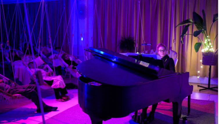 Concert sur la musique d’Érik Satie dans le doux confort de chaises-hamacs avec la pianiste Jacynthe Riverin