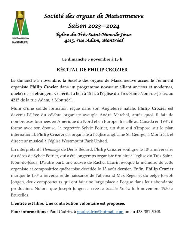 Société des orgues de Maisonneuve | Récital de Philip Crozier