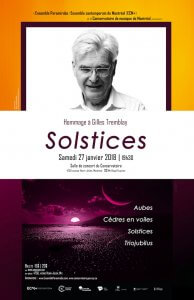 Hommage à Gilles Tremblay En Partenariat avec l'ECM+ Coproduit par le CMM le 27 Janvier à 19h30. Salle de concert du Conservatoire Station Mont-Royal ou Laurier Oeuvres de Gilles Tremblay : Triojubilus Aubes Solstices (ou Les jours et les saisons tournent) Cèdres en voiles (Thrène pour le Liban)