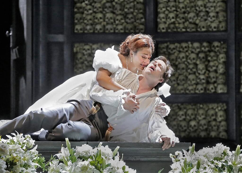 The Gounod opera is often performed cut due to its length. An archetypal French Grand Opera, it’s five acts plus the obligatory ballet, inserted by Gounod into Act Four. To keep the evening to a manageable length, the opera is usually done with just one, or at most two intermissions. As far as I can tell, the score is presented here either complete or only slightly cut. Having seen many R&J over the years, this was the first time I actually saw the ballet, albeit reduced to only two ballerinas. Austere grandeur comes to mind when describing the set by Ashley Martin-Davis, predominantly grey, but with colours supplied by the costumes and the lovely white flowers. The main set is a mausoleum complete with crypts bearing names of the deceased, stylistically rather reminiscent of the striking Willy Decker Nederlandse Opera Don Carlo I saw quite some years ago with Rolando Villazon and Amanda Roocroft.