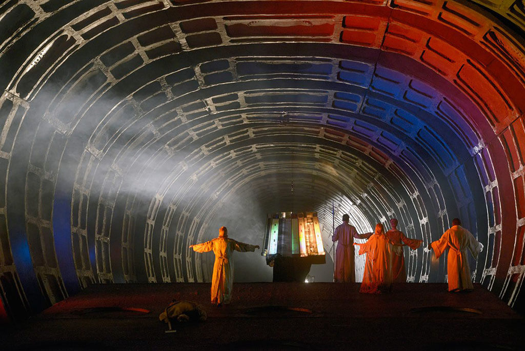 How about the production? Well, that’s another story. Legend has it that Friedrich’s set was inspired by a postcard of the Washington DC subway sent to him by a friend. Yes, this Ring is underground. The set is dominated by a long tube, cut cross-wise, spanning the width of the stage. Lengthwise, the perspective from the audience is for it to extend into infinity. A small hole here and there would occasionally open up, suggesting a bit of the outside, but over all there’s a serious lack of a sense of naturalism. When Donner strikes his hammer to clear the skies, there is no sky, just a strong light from above shining on him. For Nibelheim, the stage floor rises to review yet another level below of what is already underground. When the gods walk to Valhalla in the final scene, they are more likely walking to the next subway station — okay, I’m saying that with my tongue planted firmly in my cheek.