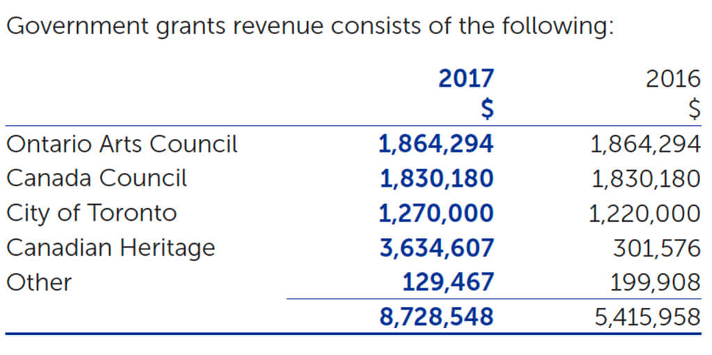 With that trick already used, this year, the orchestra pulled a different rabbit out of their hat — a $7.5M Canada 150 grant from Canada Heritage (an estimated $3.6M of which was applied to the 2016-17 fiscal year) to assist in bridging the gap with the Foundation injections. The gap would have been an estimated $5.8M. This effectively allowed them a year’s repose from having to cannibalize the foundation again, and also reduce the required yearly contributions from the foundation.