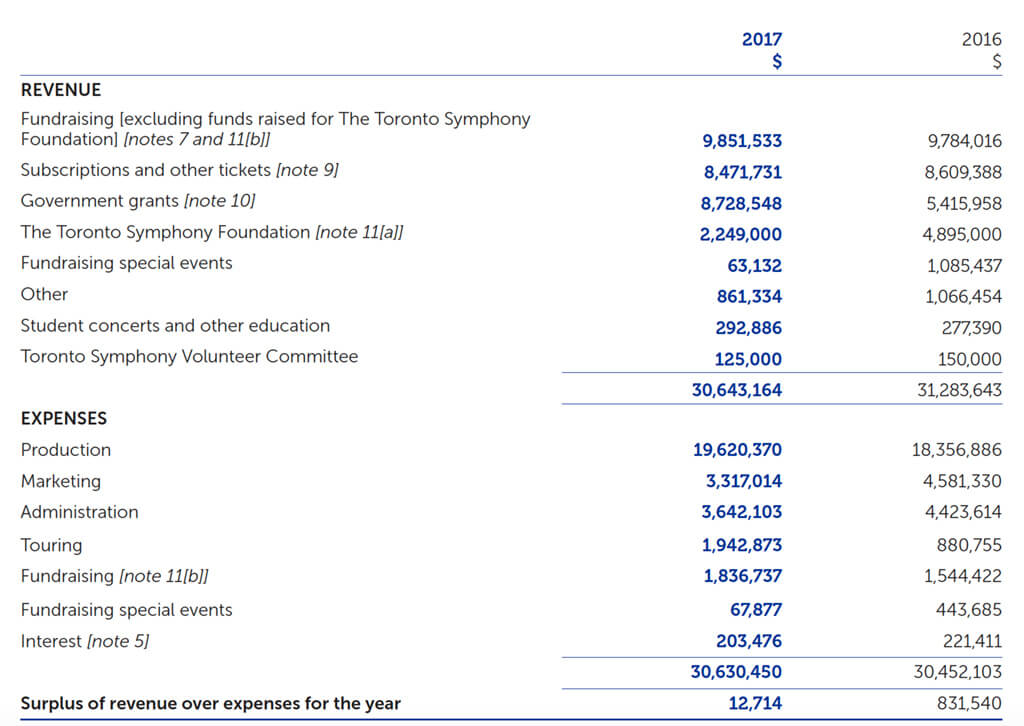 The TSO’s annual 2016/17 report shows a telling age of anxiety for Toronto’s premiere orchestra. After an analysis of a drastically different annual report format, which reads like a cross between an article and a concert program, we’ve decoded the accountant jargon to what we believe is an accurate picture of the TSO at their fiscal year-end on June 30, 2017.