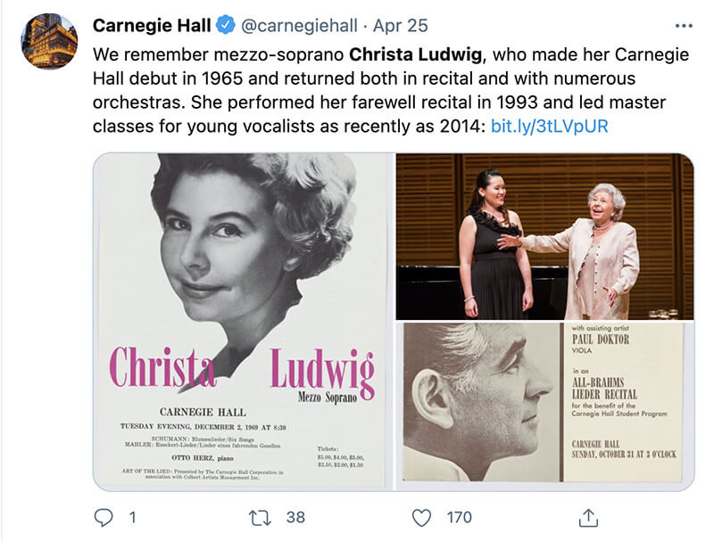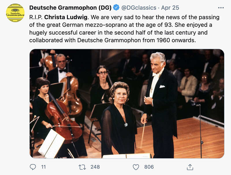 The opera community has been mourning the loss of Christa Ludwig, one of the greatest Mezzos of the 20th-century.